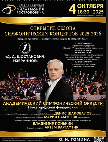 Открытие нового филармонического сезона в Нижегородской филармонии ознаменовалось уникальным концертом: музыканты академического симфонического оркестра под управлением художественного руководителя и главного дирижёра, народного артиста России Владимира Александровича Понькина, а также солисты — виолончелист Денис Шаповалов и молодая певица, меццо-сопрано Мария Самусева полностью реконструировали программу ставшего легендарным концерта, состоявшегося 12 ноября 1962 года, когда впервые и единственный раз за дирижёрский пульт встал Дмитрий Дмитриевич Шостакович.