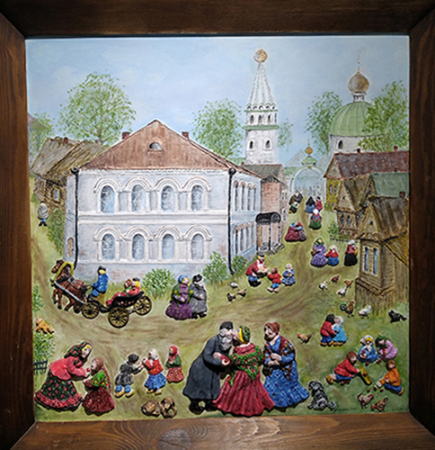 То, что мы увидели на выставке, оставило ощущение светлого, доброго, чуть ироничного, но всегда позитивного взгляда на мир. Замечательные работы в условной технике «глина на холсте» — настоящий гимн русской деревне, русской провинции, её великолепной природе, её колоритным жителям. Сама художница подчёркивает, что душа её осталась на уровне детства, в деревне бабушки. И хотя та старая деревня ушла в прошлое, тёплые воспоминания о ней мы находим во множестве сюжетов, выполненных с мельчайшими трогательными деталями. Колоритны и заголовки картин: «Пасхальное целование на Спасской площади», «Первый парень на деревне», «Слащевское гуляние», «Гуляние на масленицу», «Дорожина», «Сплетня», «Городецкое чаепитие», «Катание на Церемоновом болоте в снежный день», «Крещенское купание», «Летняя страда», «Плясунья в красном»…